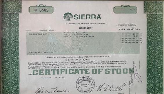 Not All Fairy Tales Have Happy Endings Page 363. A souvenir from better times. For years we tracked our sales of PC software against a competitor, Electronic Arts (EA). I told the staff that on the day we topped EA, I would issue EVERYONE in the company ten shares of Sierra stock. It wasn't fast or easy, but we did it! This is Roberta's actual stock certificate, which we keep framed at our home.